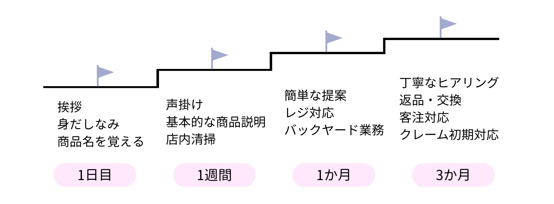 だからこそ、すべてを一度に求めるのではなく、基礎 → 接客 → 提案 → レジ…と段階的に“できる”を増やしていく育成設計が重要になります。