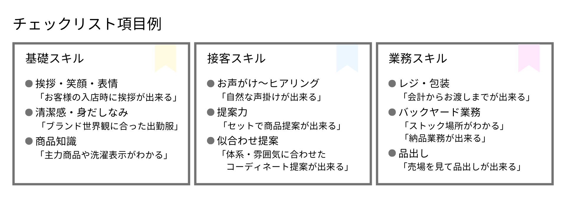ここでは、アパレル店舗で最低限押さえておきたい新人教育チェックリストの基本項目を紹介します。