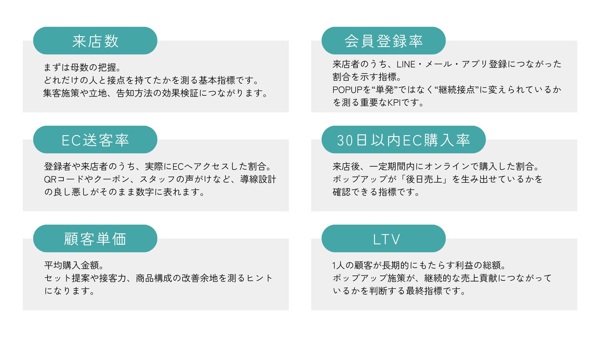 来店数や当日売上だけで評価する従来のやり方では、POPUPは“単発イベント”で終わってしまいます。